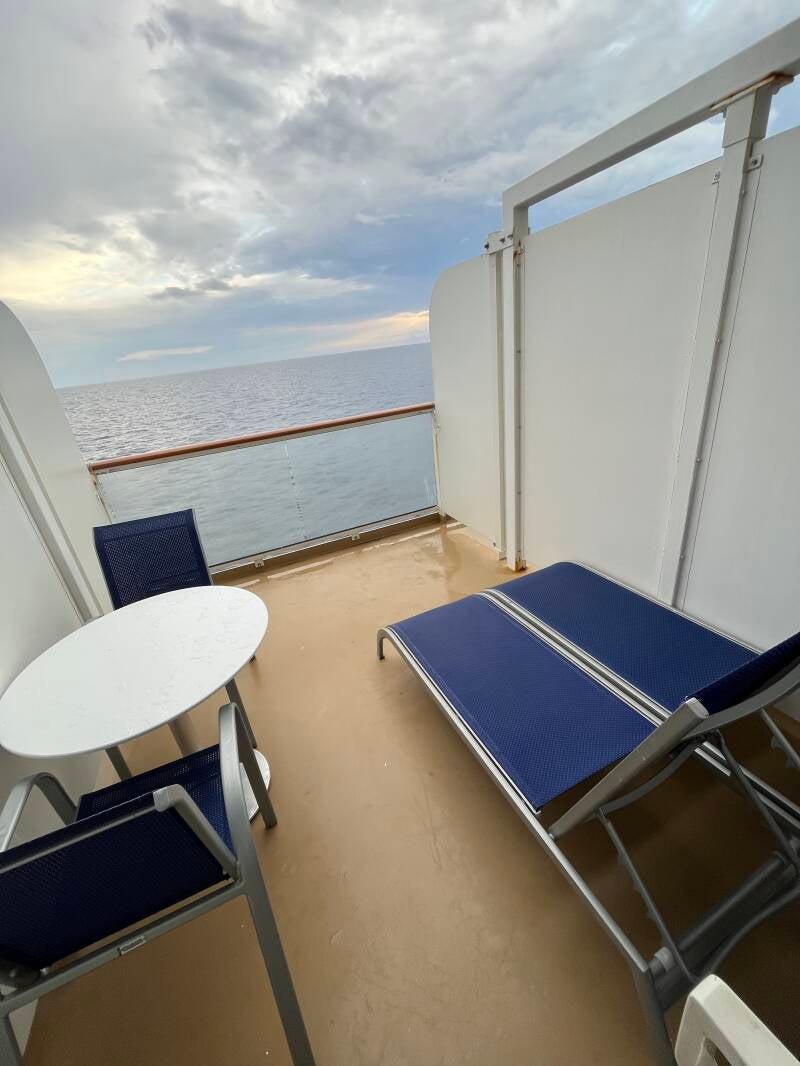 Balcony size - plenty of room. Rarely does a standard balcony accommodate chaises And a table for two.