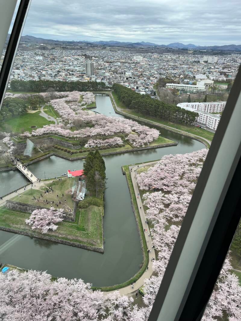 (**Top 3 Port in 2025**) Hakodate, Japan - the weather was threatening (cold with possible rain), but we ventured out. A reasonably priced taxi took us to the most popular site - with Tremendous Cherry Blossoms! Our luck was at a height. Cherry Blossoms are notoriously fickle in blooming to a schedule - having lived in the D.C. area, we know this as a fact. Weather held and we were dressed appropriately. We took a lengthy walk around the Goryokaku Fort and Park before queuing up for the Tower. Price of admission is 1200 Japanese Yen (about $8, subject to change). While crowded, the staffed elevators maintained a constant flow of visitors up and back, after a 20 minute wait. The view was worth the cost and time.